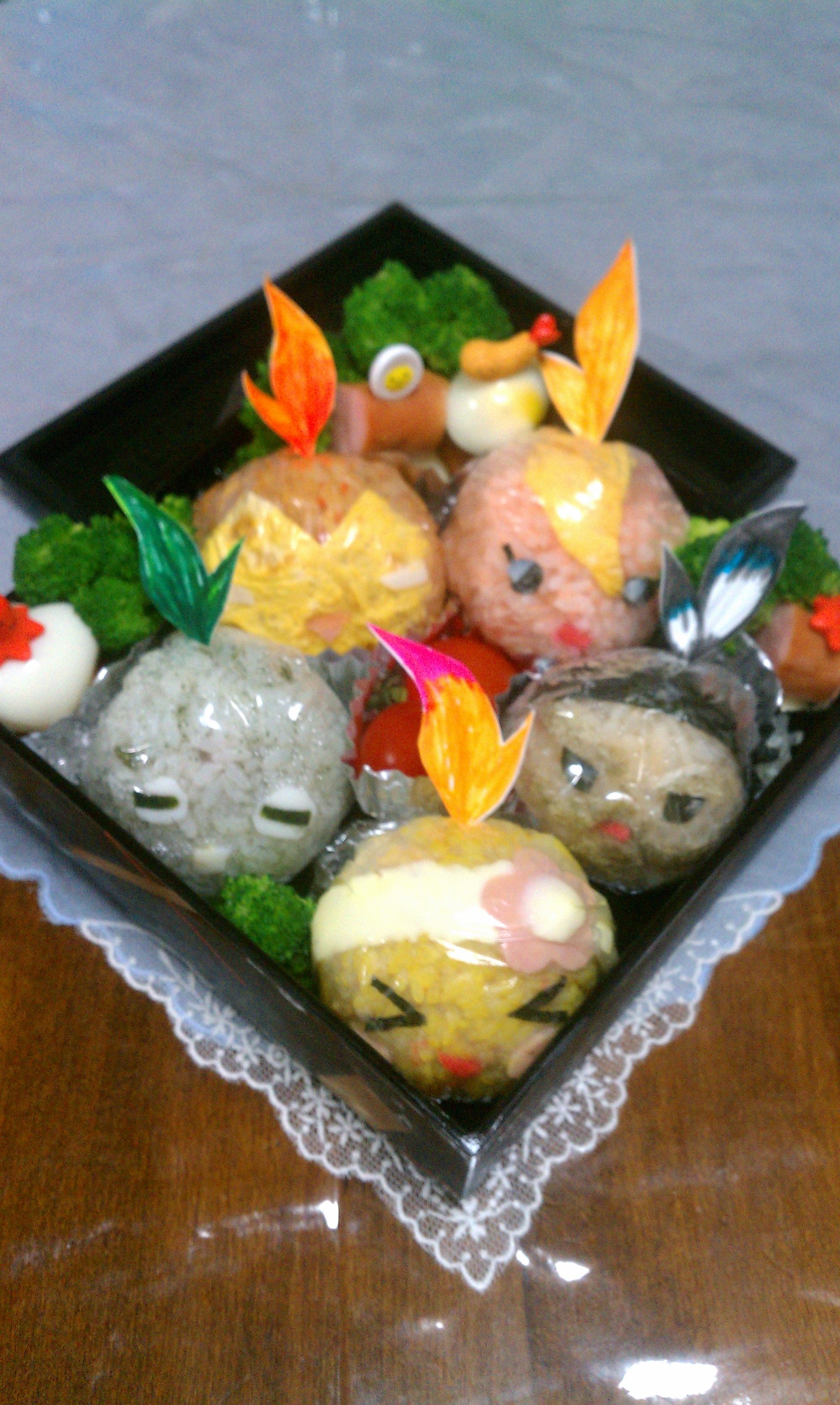 プナシー王国のお弁当 ・偉大な勇者はカレーピラフおにぎり ・長老は焼きおにぎり ・神聖クラージマンは紫蘇おにぎり ・ハイウィザードはタラコおにぎり ・NO1戦士はチキンピラフのおにぎり |