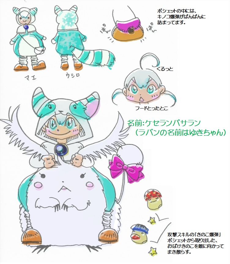 もふもふしたまるっこい幻神が欲しいなぁ。と考えてみたところ、ラパンとラット。。。(そして、キノコッコ)が、すでに、幻想世界にはいるので、それらをまぜこぜしてみました。 |