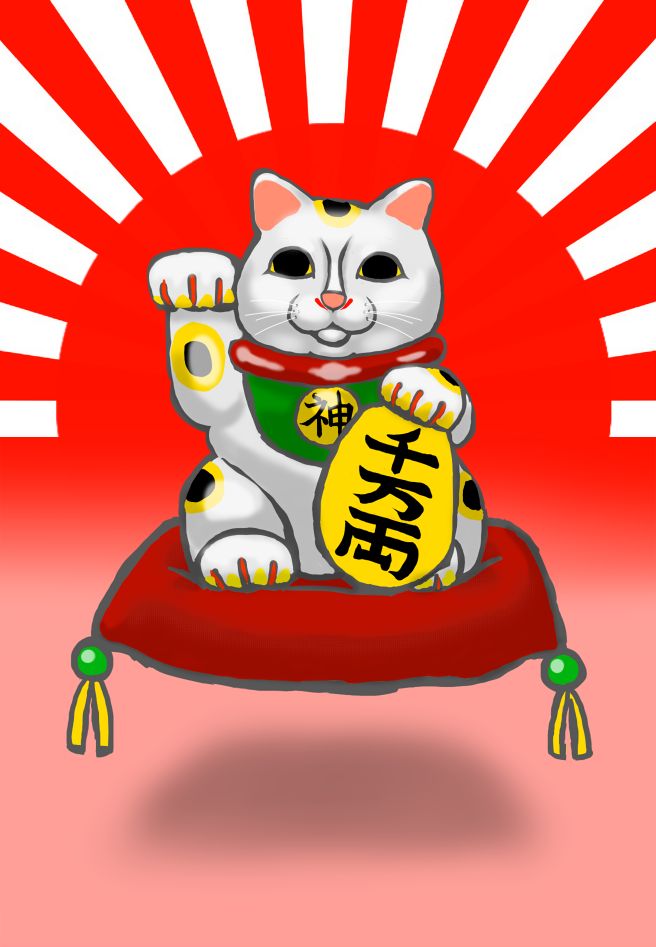 彼が手に持つ黄金色に輝く楕円形の物体は其の国では「小判(こばん)」などと呼ばれ、そこに書かれている「千万両」とは莫大な、途方も無い財産の山、巨万の富、などという意味であり、それを手招く様子から「招き猫」と呼ばれている。