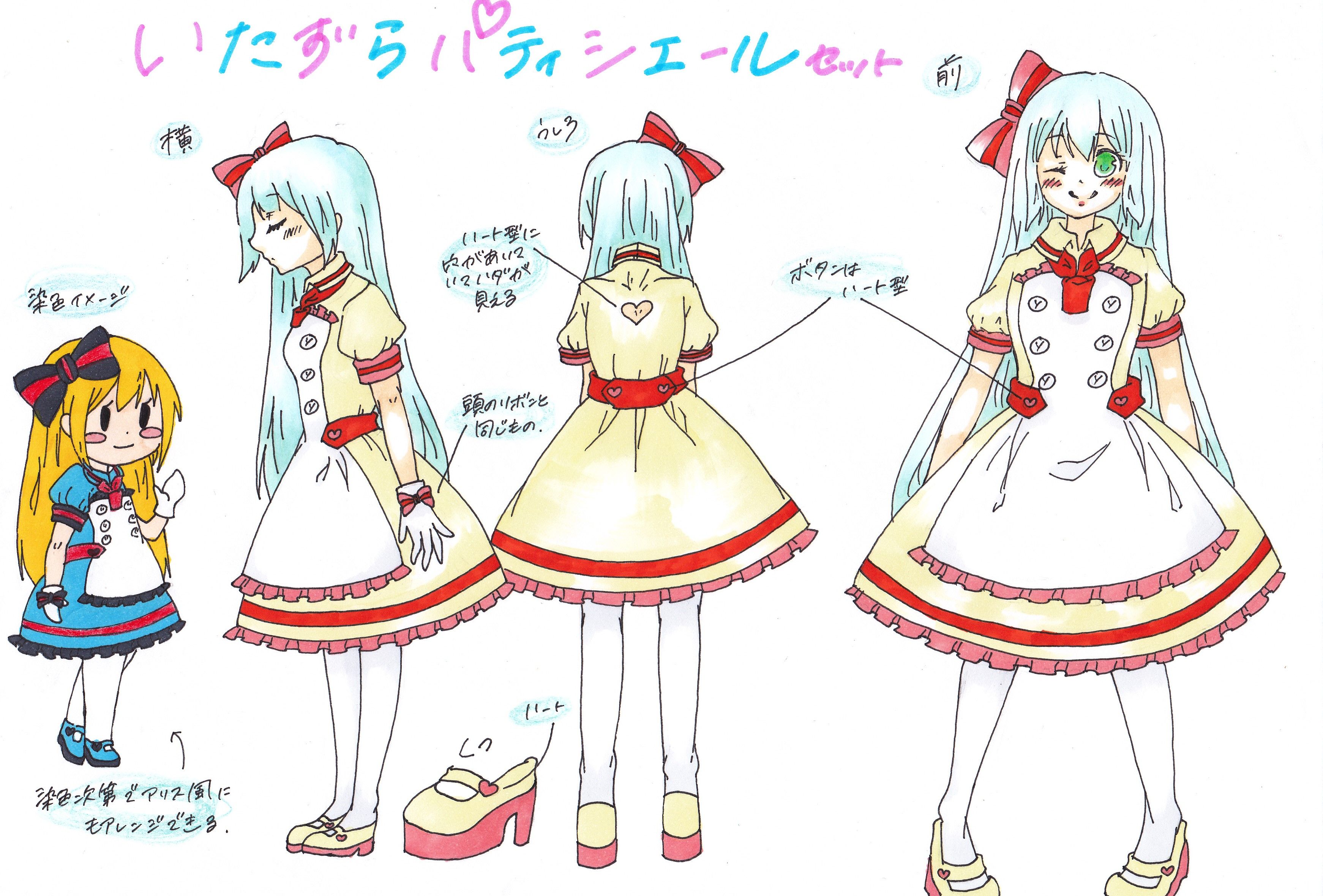 デザイン画では、スカート丈が少し曖昧になってしまいましたがちょうど膝が隠れるくらいの丈をイメージしています。 また染色前のワンピースと靴の色もデザイン画をスキャンした所、分かりにくくなってしまいましたが薄いイエローをイメージしています。