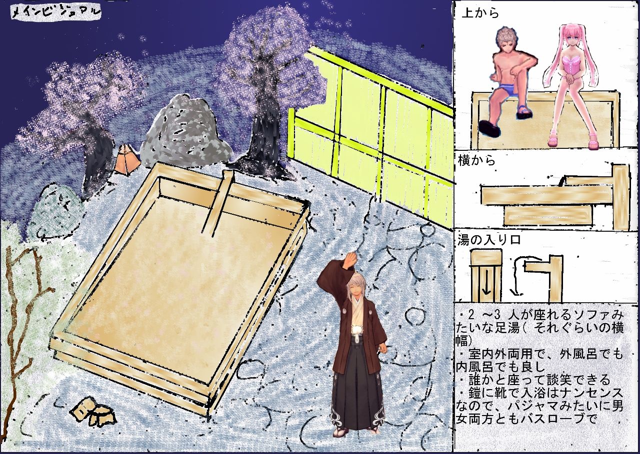 タオル一枚になって浸かるモーションも捨てがたいですが、みんなで座って談笑できる感じを意識しました。