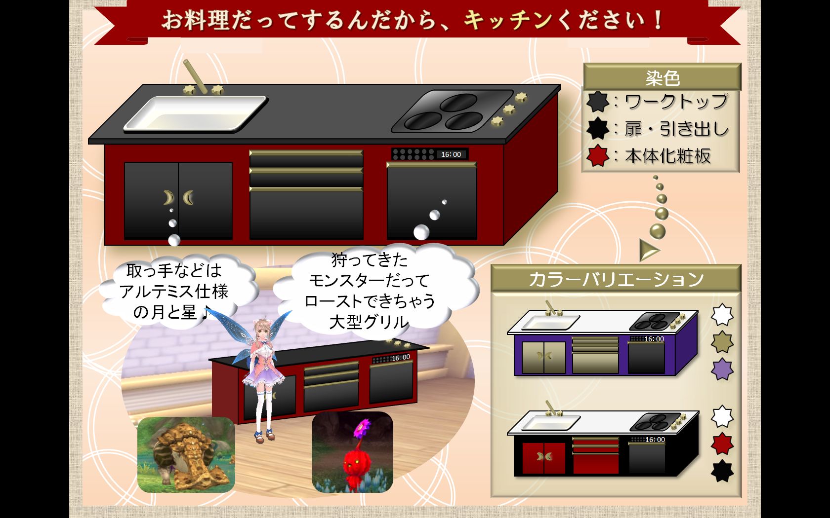 ・家のキッチンで料理のミニゲームをすると、お料理経験値が20%増加するとか…<br />