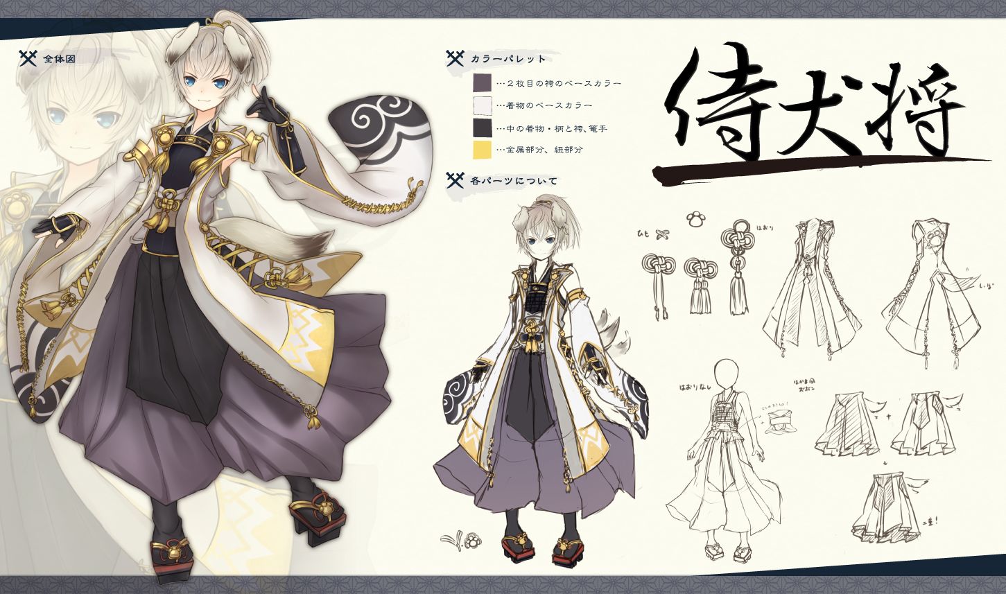 侍犬将(さむらいたいしょう) 「SINOBI」とはまた違う「SAMURAI」を意識し軽装かつ、袴と羽織と甲冑を身にまとった侍大将ならぬ侍犬将! 自分が認めた起源の使者に忠義を尽くし。いざ、推して参るお! ※犬耳とふさふさの尻尾は重力実装が希望です |