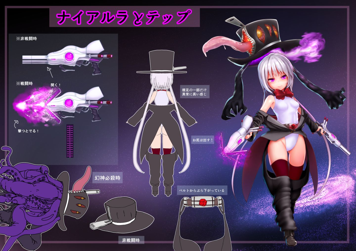 >>にゃもらげさん 返信遅くなりまして申し訳ありません。 この場を借りて1000文字制限で泣く泣く本文から削った補足も含めるので長文で失礼します。 元ネタのナイアーラトテップを幻想神域の世界にマッチするように コミカルさを持たせるならどうしようと思った結果2体に分けて片方に禍々しさを持たせました。 あとメジェドちゃんのように少女と謎の生物の組み合わせ・・・良いよね!!ってなったのもあります。 そう言って頂けてとても嬉しいです。 ナイアルラはもともとは禍々しい服デザインでしたが、周りからみて露骨に邪悪さがにじみ出る恰好をナイアーラトテップが擬態するときに着るかなー?と思ったのと、 掴みどころのないキャラクターのイメージとしてマジシャン風の服にしました。 テップをシルクハットの化け物にしたのもそれからです。 髪色は銀髪ですがピンク色とか緑色で描いていたら他のパーツから髪だけ浮いて見えたので今の色になっています。 マジシャン風だから武器は杖系統のステッキかな・・・と思いましたが良いデザイン浮かばなかったのと元ネタから考えるとなんか未知の技術を使った武器を持ってそうだったので、近未来的な銃を持たせました。 双銃なのは、かっこいい・・・からです。 少女なのは理想の少年を描くのが下手くそだからというのもあって最初から少女で進めました。 お尻は趣味です。 テップのウニュウニュですが、見た目の体積からかけ離れた量の中身が出てくるのってロマンですよね!! ナイアーラトテップの禍々しい要素を一身に受けてるので完璧にクリーチャー化させてます。 喋れないぶん、大きく動きまくってほしいなぁと思います。 自己満足の長文失礼しました。 コメントありがとうございます。 |