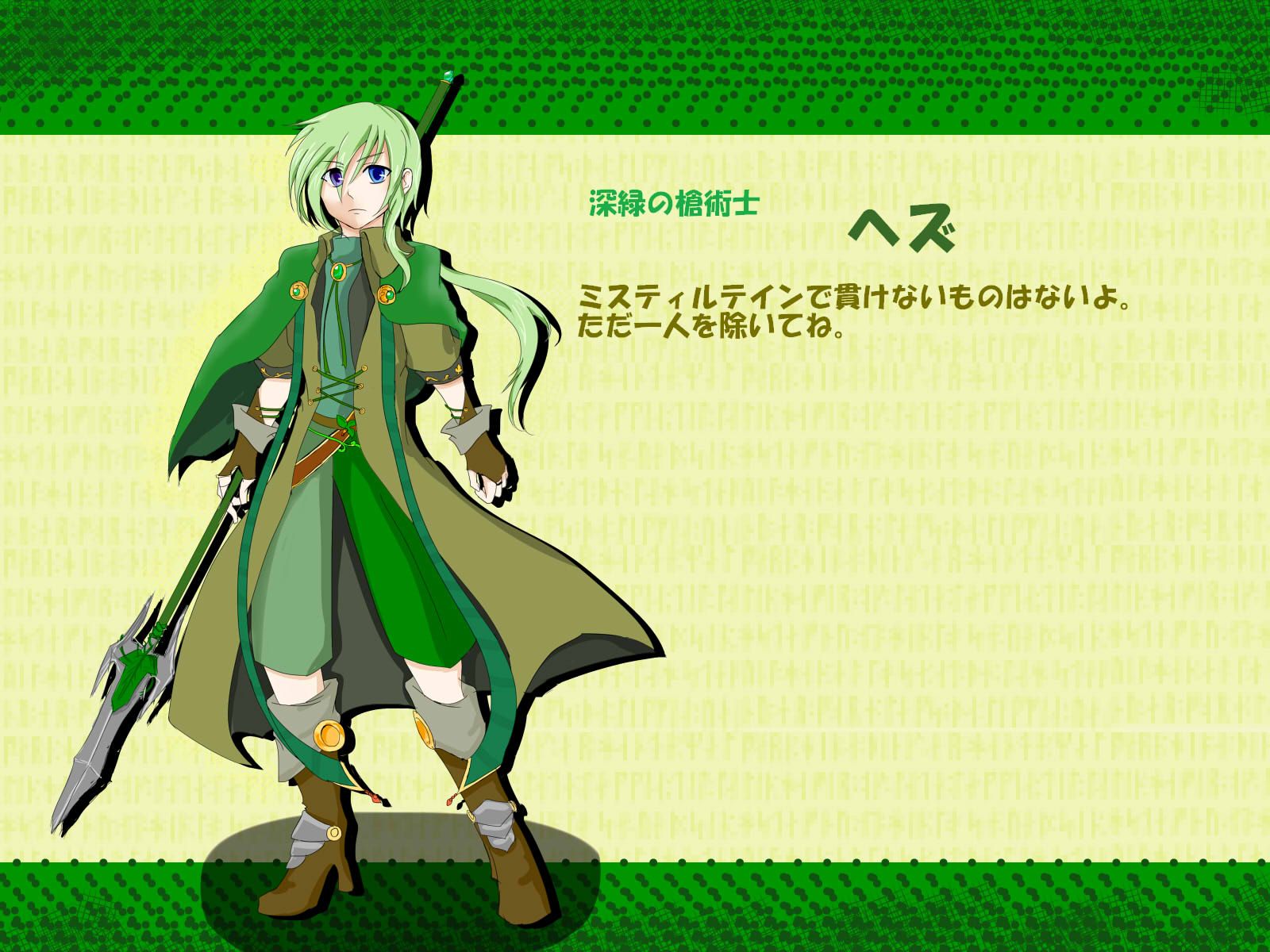 ややオッドアイ気味で、右目はほとんど見えていませんが、戦いのときになるとヤドリギの魔力を受けて、右目で照準を合わせ槍を打ち込みます。
