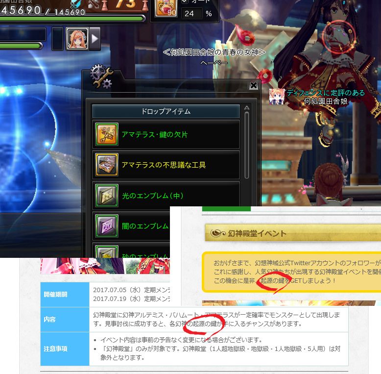 「現物ドロップなんてまさかね…」と想定してはいましたけれど、さくさくさんのおっしゃる通りですね。早とちりしてしまったようです。 どうせ鍵現物は落ちないのならば、最初から"起源の鍵"ではなく幻神名だけを記してくれれば ここまで怒りを露にする事なかったのですが、ここら辺り直して欲しいですね(ドロップ枠が箱Lv関係なく1枠なのも含めて) 一つだけ確かな事といえば、こういった誤解を招くような書き方をする運営が悪いという事ですね( |