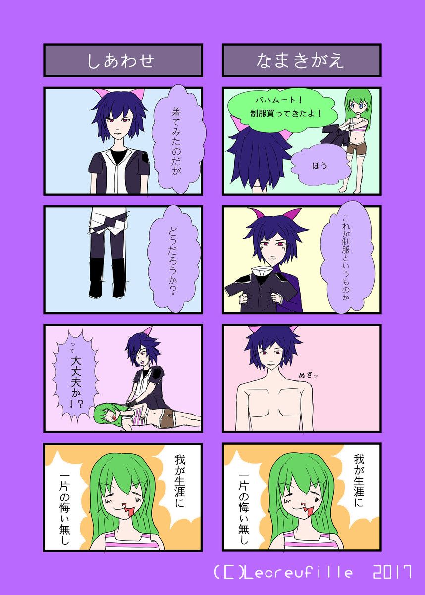 バハムートの学園スタイル入手記念!ということで バハ様に制服をプレゼントしたときの様子を妄想で描いてみました 全国のバハ様ファンの皆さんゴメンナサイ(m'A'm) わたしはしあわせです ※脱いだって言っても、ちゃんと下は履いてますん※ |