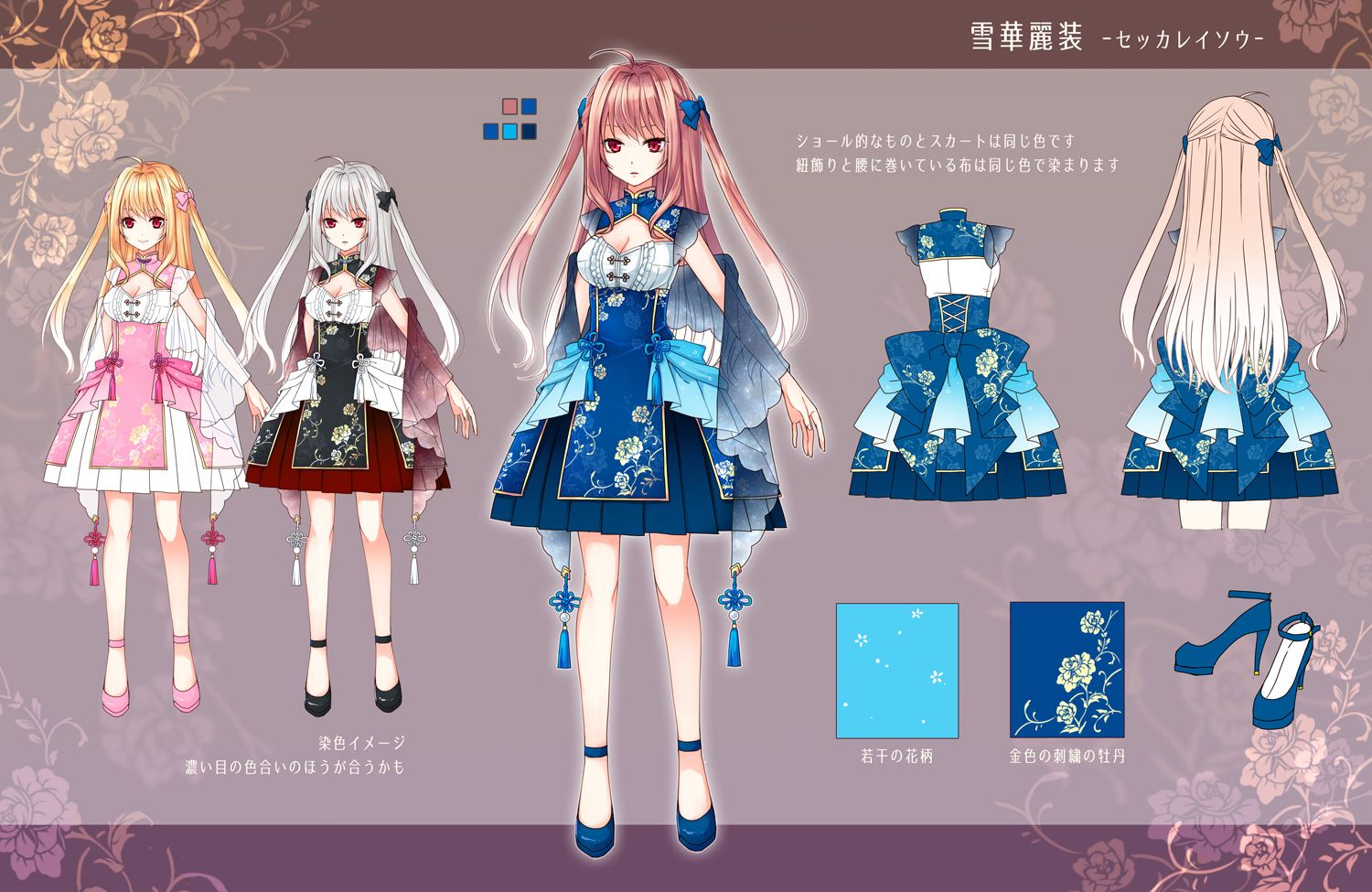 中華ロリータで大人っぽく可愛らしく…なイメージでかきました 髪の毛と腰まわりの布に白のグラデーションが入ってる感じです 毛先が気持ちふわっとしてます ショールと袖部分(?)はキラキラしたちょっと透けてる素材です 濃い目暗めの染色のほうが模様がよく出るかな~とおもいました |