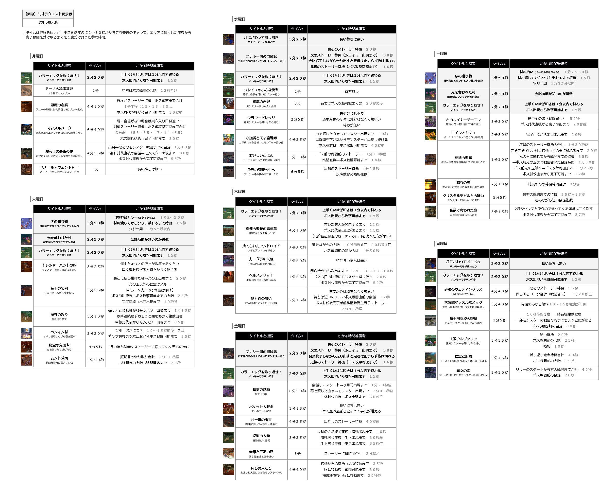 ミオラ掲示板クエって、それぞれどの位の時間が掛かるのか 普通に気になったので、計って曜日別の表にしてみた。 気付いたのは、今まで単に短いのだけをやっていたわけじゃなく、 多少時間が掛かってもやる気になるものを自然と選んでた事。 …参考資料ですが興味ある方は使ってやって下さい。 |