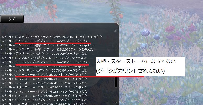 正直、これ以外はしっかり溜まっていたかって言われるとCTバグ(速さ0%計算)が発生してるおかげでスキルがうまく回らない影響があったり、ログが一気に流れるので回収めんどくさくてやってないんですが、とりあえずは2回スキル使って溜まらない状況はみんなに出てるのかなぁと。。。 |