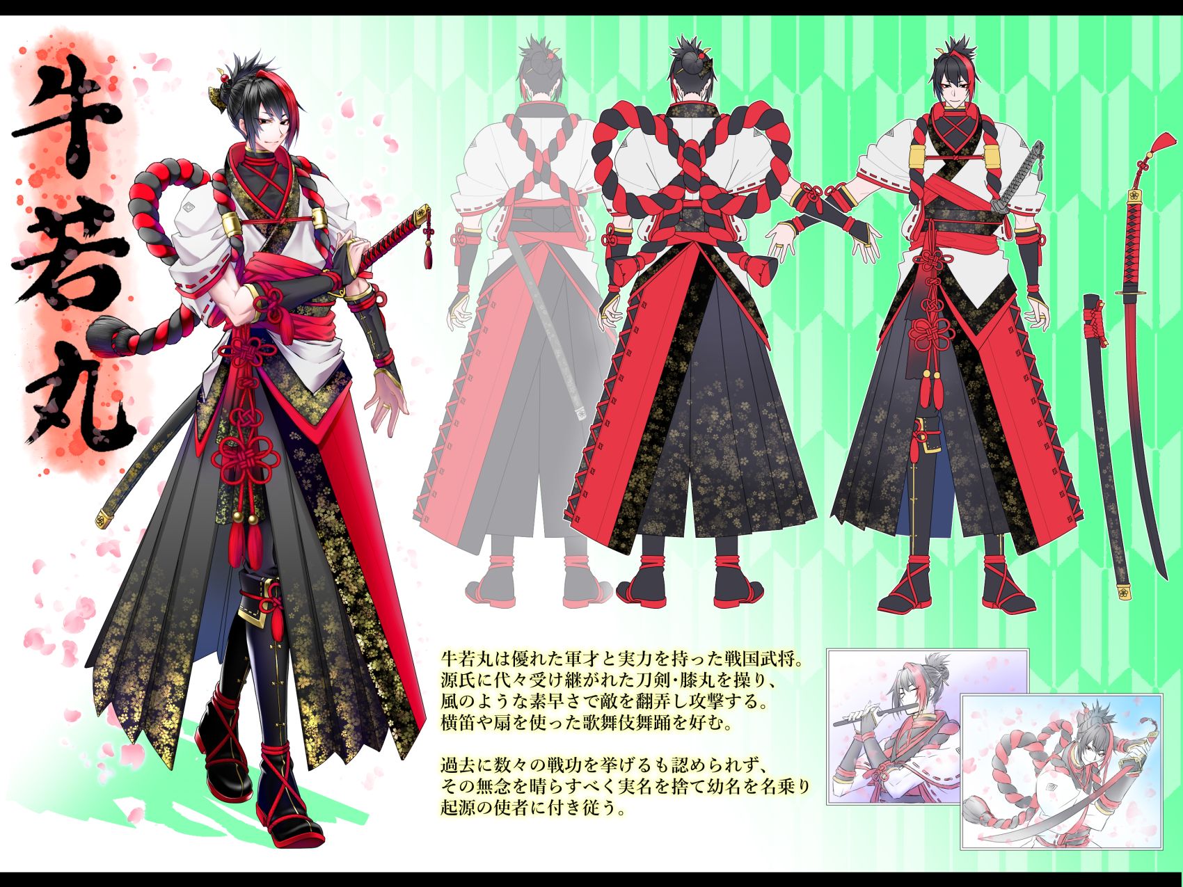 ・登場時は横笛を吹きながら現れたり、リンク時は扇を持って舞ってほしい。