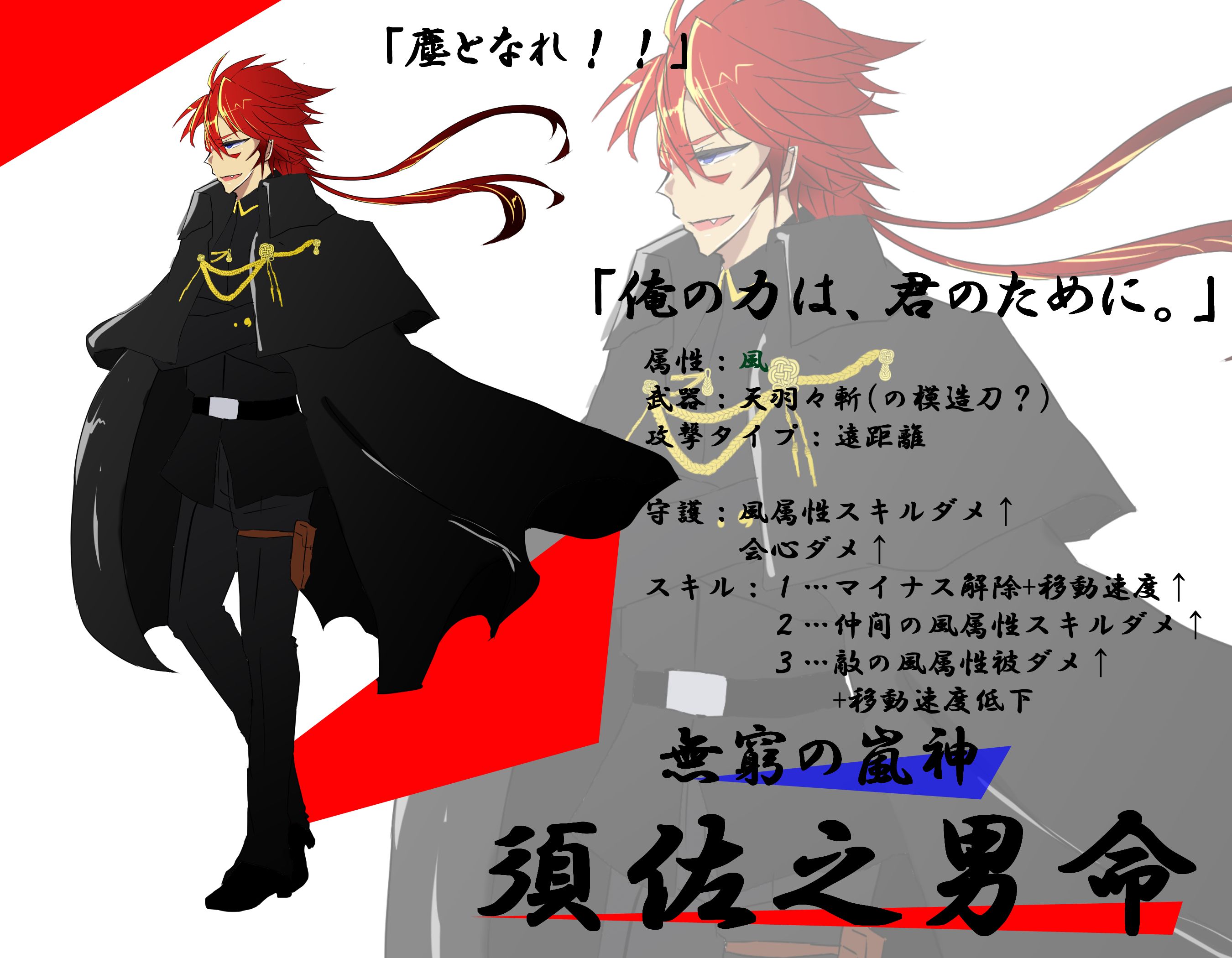 武器は「天羽々斬」で普段は見た目ごくふつうの剣ですが、力を開放すると十拳剣となり、またその十の突起している刃をまるでSFのごとくビットみたいな感じに自由自在に飛ばしたり操ったり…