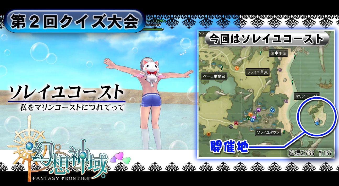 何故かこちらのが回覧数が多いので詳細を記載します。 ★------詳細------------------------- 【日時】2月16日 日曜日 【時間】17:00より開催 1時間~1時間30分ぐらいを予定してます。 【場所】ソレイユコーストのマリンコーストの海にある島 【座標】X:766 Y:167辺り ※別途マップが下部のurlで見れます。 【ch】7ch 【マップ】 ※ファンアート・SS掲示板にマップを載せました。 https://genshin.x-legend.co.jp/community/post_content.php?post_id=6130 ↑ファンアート掲示板URL ★------イベント内容詳細------------------------- 【景品】7000円分ぐらいの景品を予定 それ以外にもプラスαで出します 【ルール】1問正解で予め発表しました商品をプレゼント 1問につき何回でも答えてOK 面白いフライング歓迎♪ 判定が微妙な場合は私が正解だと思った人が正解となります。 【出題内容】適当です!難しい物から簡単なものまであります。 アンケートのクイズジャンルも入れます。 今回は幻想神域の問題もあります。 【回答判定】ひらがな カタカナ 漢字 が混合してもOKとします。 ※1)めろんぱん メロンパン どちらでもOK ※2)必要な場合は予め出題時に『漢字で答えて下さいと指示します。 正確に発音できる状態で正解とします。 ○ナウシカ ✕ナウシk ←あとちょっとw 【正解回数制限】なるべく多くの人に景品を持ち帰ってもらいたいので参加人数が多い場合は一人1個か2個までとなります。 【面白かったで賞】面白かった人に何かプレゼントがあるかも? 【持ち物】海での開催となりますので水着持参でお願いします。(私服でもOK) 景品がショボイですが皆様のご参加お待ちしております( ´ ▽ ` )ノ 質問やご意見等ございましたら、こちの掲示板もしくばゲーム内で『Photoshop』までお声がけ下さいませヽ( ̄▽ ̄) |
