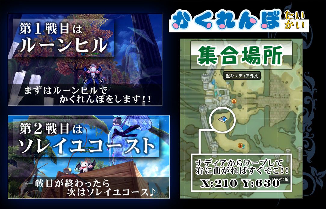 こんばんはヽ( ̄▽ ̄)ノ いやおはようですね^^; 個人イベント第3回目は、アンケートにより『かくれんぼ』に決定しました。 ちょっと文章が長くなってしまいましたが ◇------詳細------------------------- 【日時】3月16日 日曜日 【時間】17:30より開催 1時間~1時間30分ぐらいを予定してます。 【集合】ルーンヒルの幻神神殿に行く途中の所 【座標】X:210 Y:630辺り ※別途マップが下部のurlで見れます。 【開催】第一戦目はルーンヒル https://genshin.x-legend.co.jp/community/post_content.php?post_id=7321 第2戦目はソレイユコースト※下記マップが集合地 https://genshin.x-legend.co.jp/community/post_content.php?post_id=6130 【ch】7ch 【マップ】 ※ファンアート・SS掲示板にマップを載せました。 ↑ファンアート掲示板URL ★------イベント内容詳細------------------------- 【景品】7000円分ぐらいの景品を予定 それ以外にもプラスαで出します 【ルール】①ギルド『イベント企画隊』のギルメンがマップ内に隠れてるので探しだす! ②見つけることに成功したら隠れてるギルメンに『決闘』を申し込む(名前確認と被り防止の為) ③見つけた人から秘密チャットで確認のメッセージが来ます。 ④集合場所まで戻り私Photoshopから景品をゲット! ⑤まだ他のメンバーが隠れてるようなら更に探そう! ※見つかるまで鬼は動きません。移動してる場合は発見され戻ってる最中です。 【景品詳細】当日集合場所で誰を発見したら何の景品が貰えるかを説明します。 例)Photoshopを見つけたら20枠鞄×1個 など 【特別景品】一つだけハズレ景品の『ボッシュのショットガン』を用意してます。 ボッシュのショットガンを手に入れた人は最後に良い事があるかも!? 【お願い】幻神をしまった状態でご参加お願いします。 始まる前のフライングで捜査はしないで下さいw |